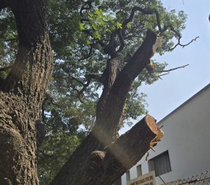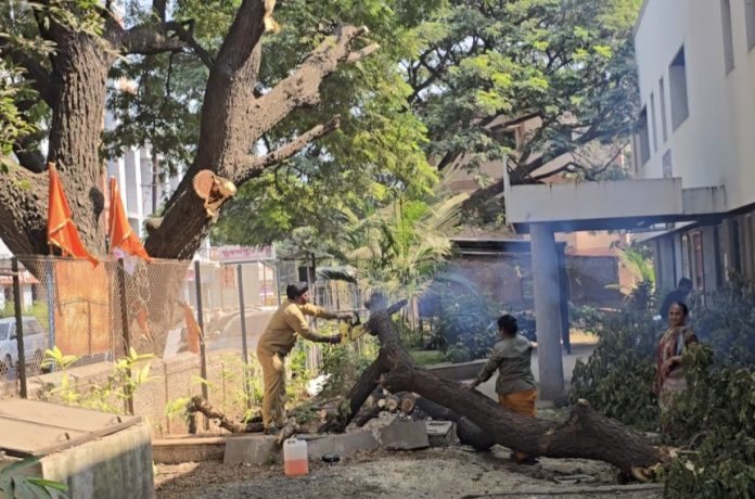 उरुळी कांचन येथील बायफ लॅबोरेटरी सेंटरसमोरील जुन्या झाडाची एकतर्फी कत्तल; नागरिकांच्या सुरक्षेचा प्रश्न ऐरणीवर