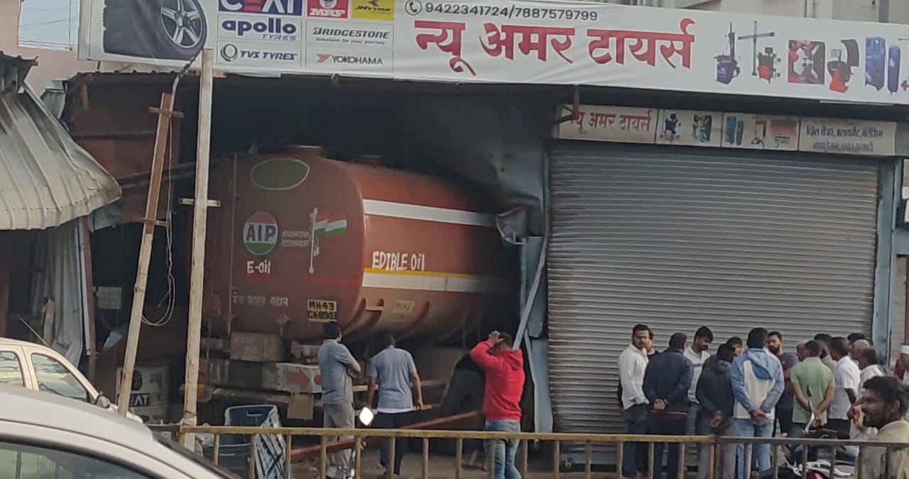 🔹 ऑइलचा टँकरला आडवे आलेल्या वाहनाला वाचवण्याच्या प्रयत्नात नियंत्रण सुटून रस्त्याच्या बाजूला असलेल्या अमर टायर दुकानात घुसला